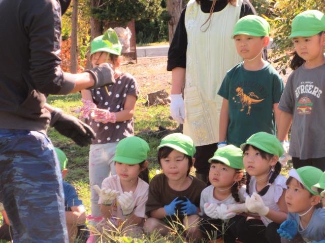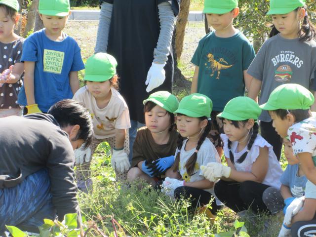 さつま芋の葉の形やねっこが実るお話を興味深く聞いています。(真剣な表情ですね)