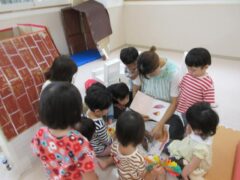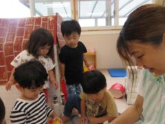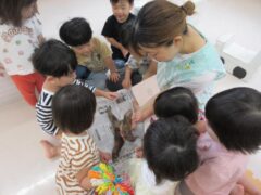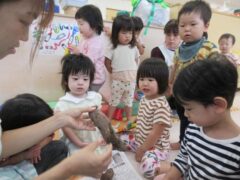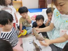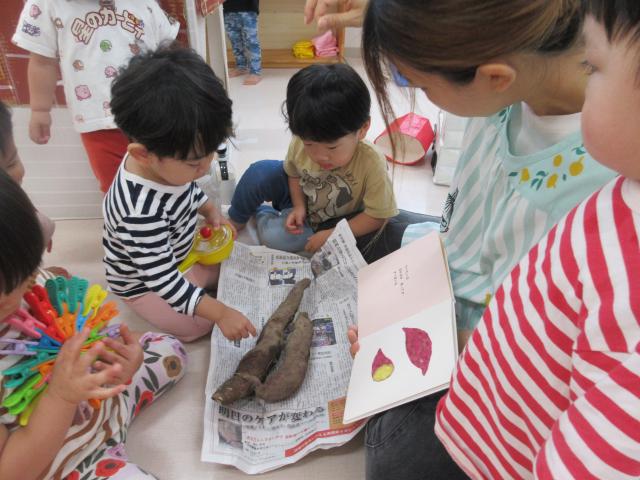 この日、ちょうどさくらさんでさつま芋の絵本を見ていたので、収穫したさつま芋を見せてみました。