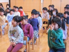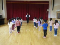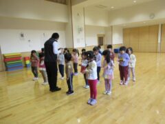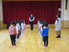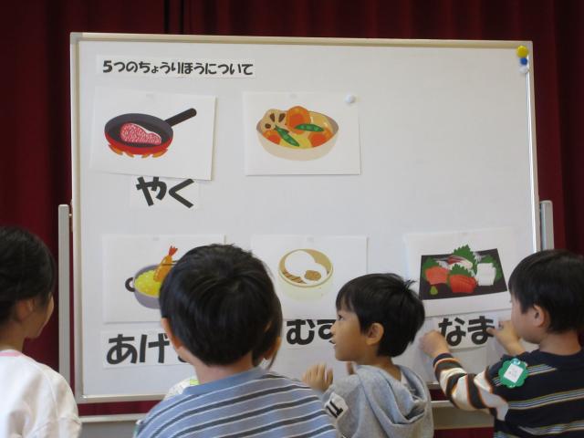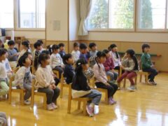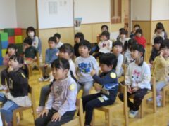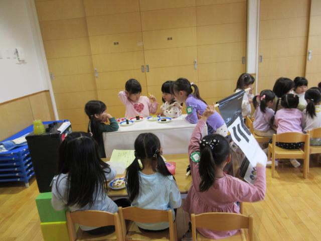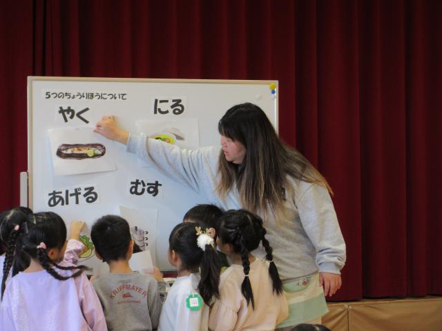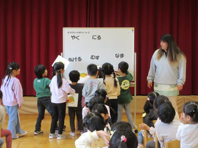 毎月1回きく、ちゅうりっぷ、すみれぐみさんは食育についてお話を聞く時間があります。