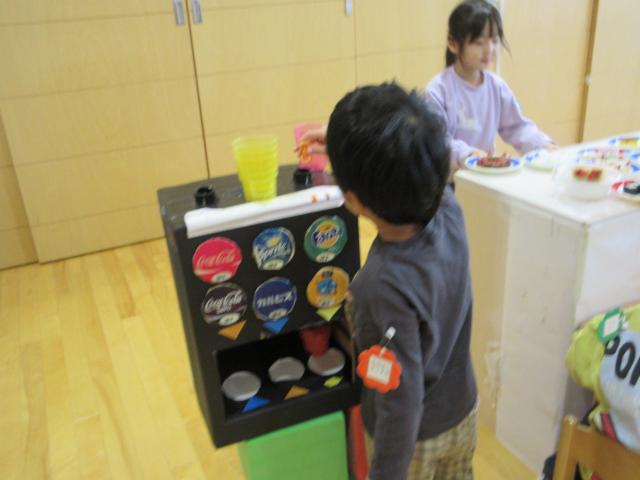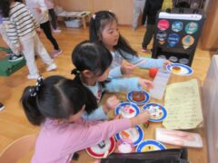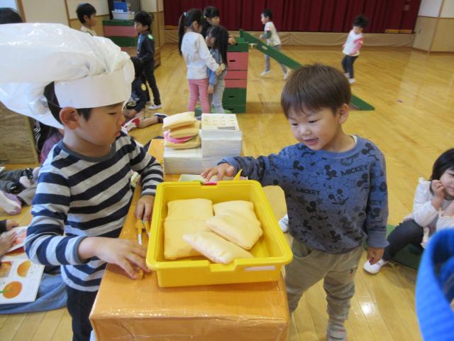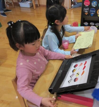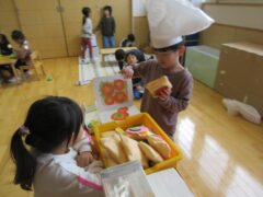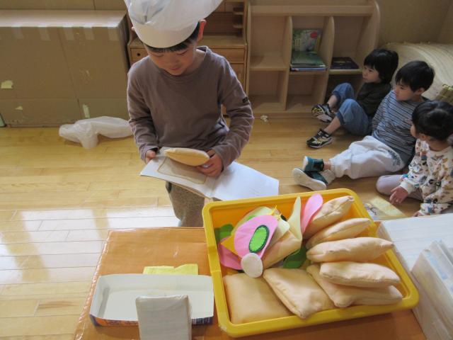 季節によって遊びは変化しますが今はお寿司屋さんがオープンしています。回転寿司は子どもたちにとってなじみのあるようでイメージが共有しやすいようです。