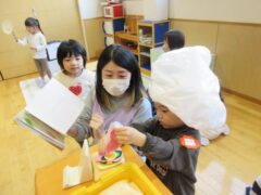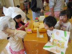 調理法ときくと「子どもにはむずかしんじゃない?」という印象を持たれるかもしれませんが、おままごとあそびでイメージが膨らみ遊びの幅が広がったり年長さんのクッキングにもつながったりして食事に興味を持つ機会になっています。